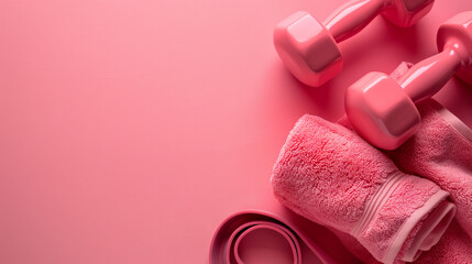 Pink fitness background, pink dumbbells, top view photo with copy space, monochrome pink, workout equipment for exercise