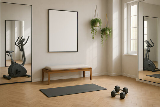 luxurious home gym with large windows overlooking backyard, contemporary fitness space with strength training and cardio machines in a bright and airy workout area