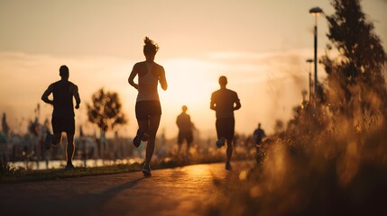 Silhouettes of a group of friends running together at sunset in a park.