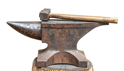 Rusty blacksmith anvil with a wooden-handled hammer resting on its face.