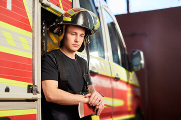 Portrait of tired male firefighter standing near a fire engine at department. Young exhausted fireman in protective uniform looking at camera after fire against the background of big red truck