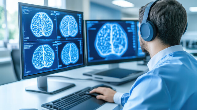 A person wearing headphones is analyzing brain scans on multiple computer screens in an office. Technology, analysis, healthcare, professional