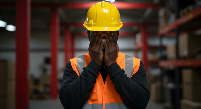 Engineer or Factory worker feeling tired from hard work in a factory, weak, hopeless, burned out, Fired Unemployed Feeling Stressed.