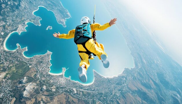 Skydiver midfreefall over a scenic landscape