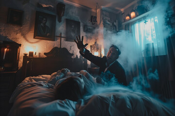 exorcist with bible and cross standing over demoniacal yelling girl in bed