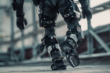 An exosuit in action, with a person wearing a mechanical suit designed for strength augmentation, highlighting the potential of wearable robotics for industrial and construction applications