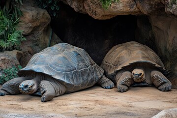 Two giant tortoises rest near a rocky enclosure with green foliage behind.