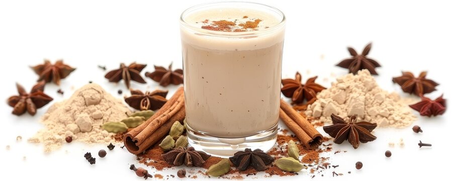 Cold chai in a tall glass, garnished with a cinnamon stick and cardamom pods, exotically spiced and isolated on a white background