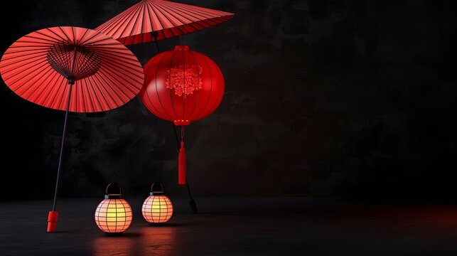 Lanternes chinoises, ombrelle japonaise rouge sur fond panoramique noir, bannière web ou header asiatique zen.