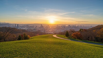 Sunrise over mountainous horizon illuminating expansive green landscape