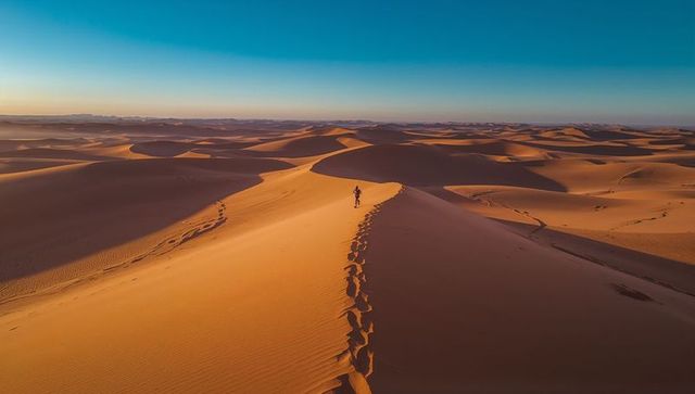 Expansive sand dunes showing rippled wind patterns under soft pastel sky
