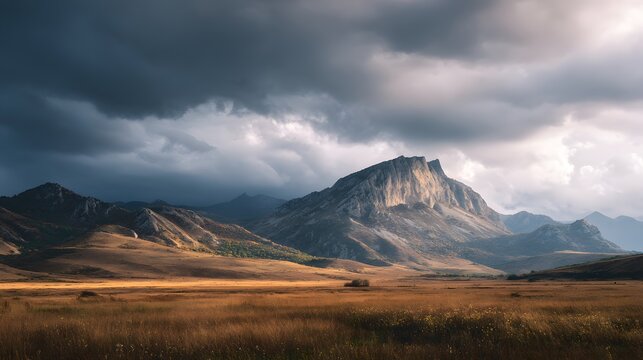 A dramatic landscape featuring a mountain under a cloudy sky