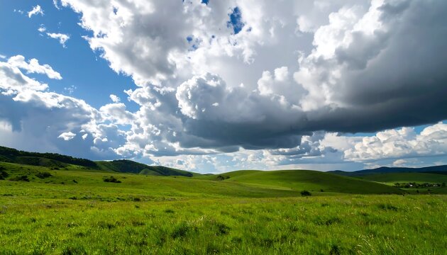 Vast green landscape with rolling hills and grazing horses under dramatic cloudy sky, evoking sense of tranquility and freedom