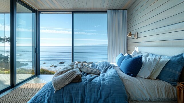 A serene bedroom features a white bed with blue bedding, complemented by a large blue abstract painting. Sunlight floods the space, revealing a stunning view of the ocean through expansive windows.