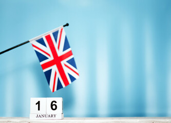 January calendar with British flag with number  16.  Calendar cubes with numbers. Space copy.