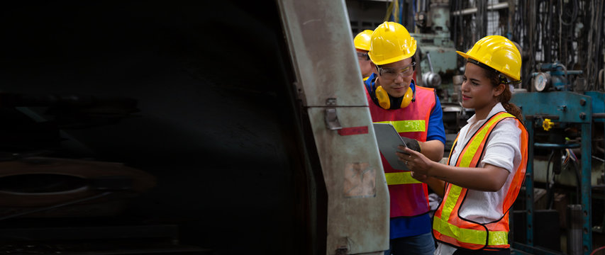 Experienced factory workers operating machinery in industrial environment