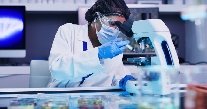 Scientist in protective goggles and mask, performing an experiment in a biological lab