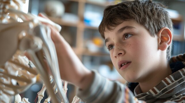 A young boy intently studying a human skeleton model in a classroom environment, exploring anatomy and biology concepts.