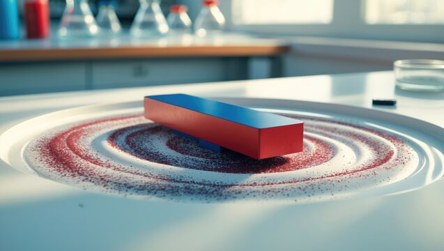 Red and blue bar magnet with iron powder illustrating magnetic field on white surface. Scientific experiment in a science class.