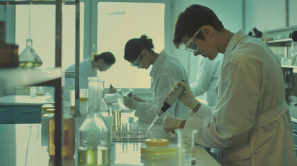 Focused scientists using pipettes and lab instruments, immersed in their experimental procedures within a meticulously organized laboratory.