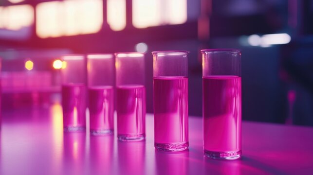 Fluorescent liquids in test tubes placed in a modern research lab, illuminated under UV lighting for experimental analysis.