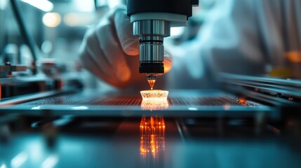 An intricate scene showing a close-up of a laser printer in action, demonstrating the futuristic technology of 3D printing and the elegance of modern engineering.