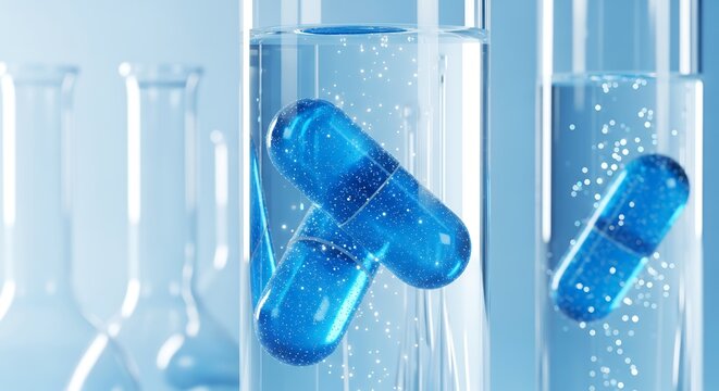 Biosimilar drug research with blue pills in test tubes for market analysis