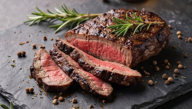 Juicy grilled medium-rare steak, expertly sliced, garnished with fresh rosemary, peppercorns. This delicious beef cut showcases tender texture, savory flavor, perfect for culinary presentations.