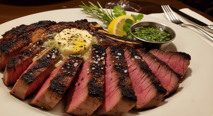 Exquisite Sliced Steak: A mouthwatering, close-up shot of a perfectly grilled steak, expertly sliced to showcase its tender, juicy interior, garnished with fresh herbs and a vibrant lemon wedge.