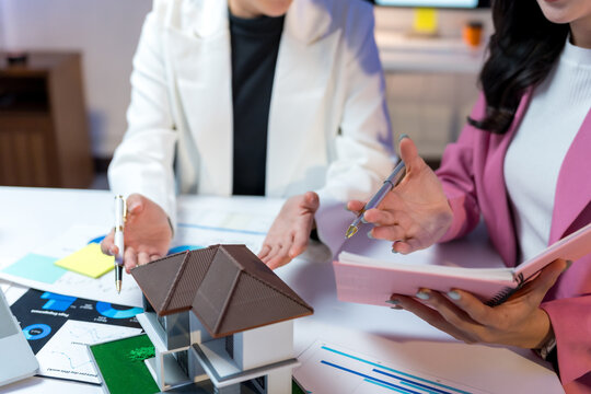 Real estate agent showing house model to client during a meeting, discussing mortgage and property purchase agreement