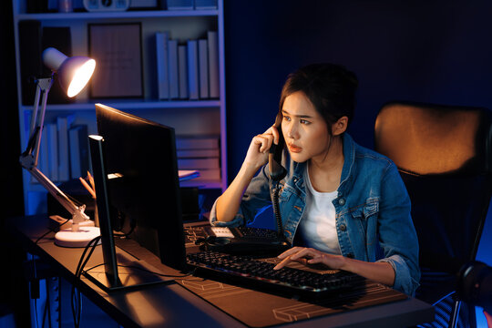 Young beautiful Asian creative woman calling on phone desk to customer or coworker explaining creator project's high profit while searching market analysis on pc at neon office at night. Stratagem.