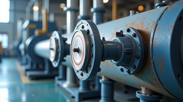 Exploded view of electric vehicle motor with detailed components on gray background. 3D rendering of eco-friendly car engine. Innovative motor tech for electric vehicles. Focus on.