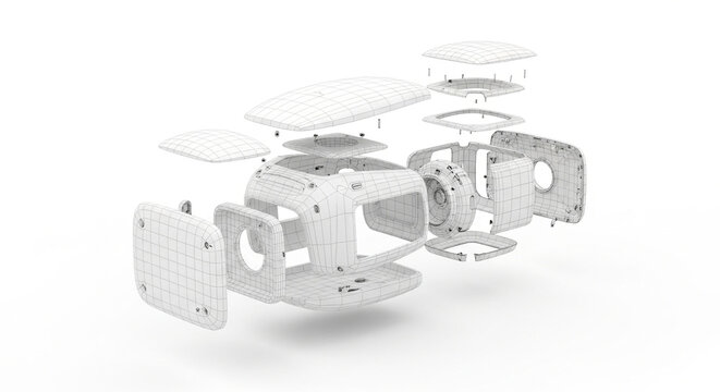 Exploded view of white futuristic device product design engineering cad rendering technical illustration