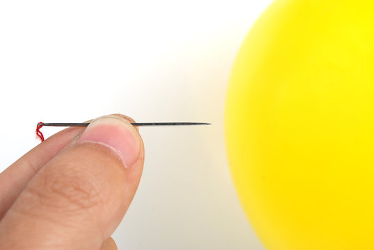 Bitcoin cryptocurrency symbol on yellow balloon. Man hold needle directed to air balloon. Concept of finance risk.