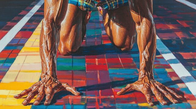 Dynamic athlete exploding from starting blocks, embodying powerful fitness motivation and the thrill of athletic achievement with vibrant, energetic colors