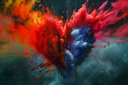 An abstract image of a heart formed by an explosion of multi-colored powder.