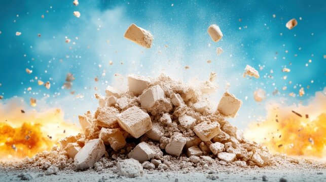 Dramatic explosion of concrete rubble with dust and debris