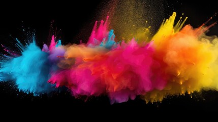 Colorful dust powder explosion black background with copy space. Dynamic blast eruption, vibrant effect, party, celebration, festival, color run element