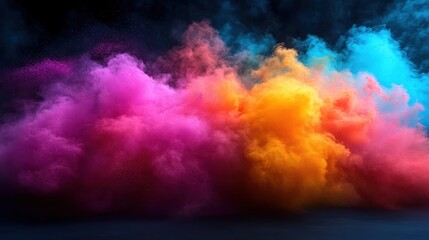 Bursting multicolor powder cloud radiating vibrant pigment particles on dark studio floor