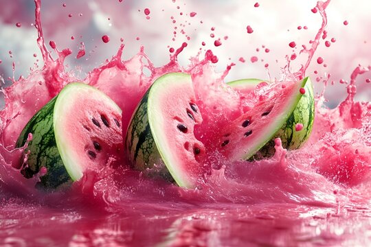 Juicy watermelon slices explode against a dark background, creating a vibrant and refreshing image.
