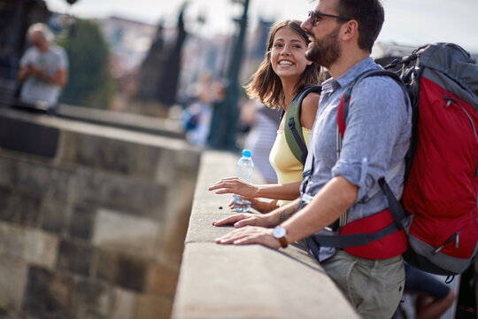 Man and woman in love traveling and exploring old town together.