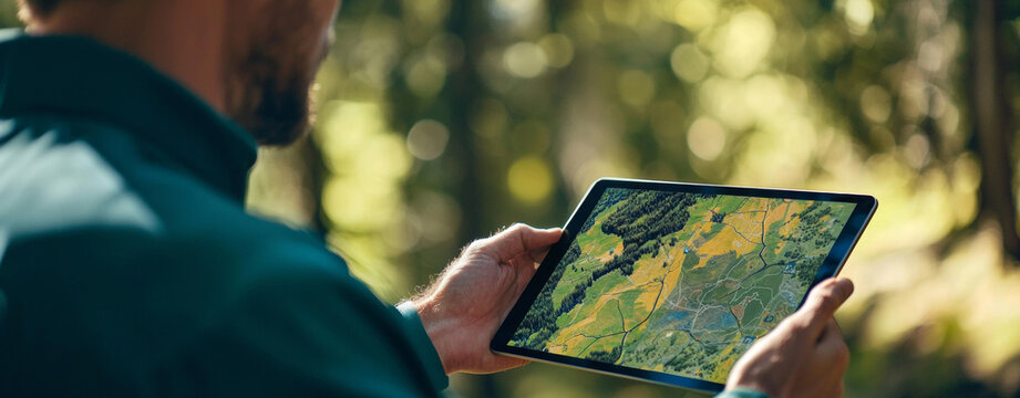 Person using a tablet to navigate a detailed map in a lush outdoor setting