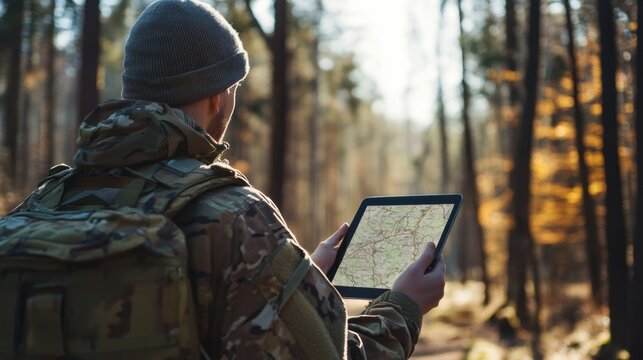 Forest ranger navigating a lush forest with a digital tablet displaying a detailed gps map for accurate tracking and informed decision-making during monitoring