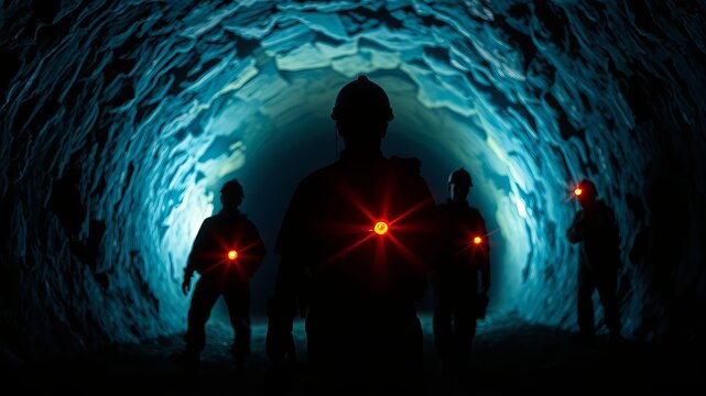Miner with Headlamp Navigating a Dusty, Dimly Lit Underground Tunnel, Highlighting the Challenging Environment of Subterranean Exploration and Indu...