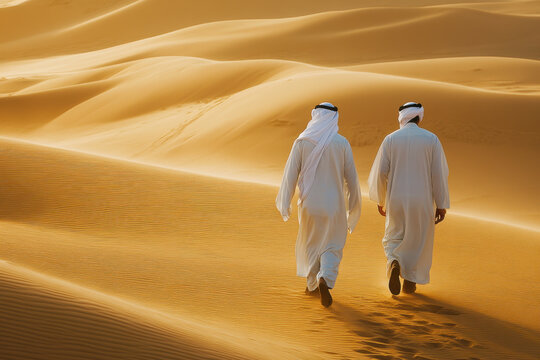 men walking in the desert, massive sand dunes under clear blue sky, with the blazing sun casting long shadows.