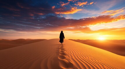 Silhouette of a beautiful arabic woman walking gracefully on a majestic sand dune under a clear blue sky