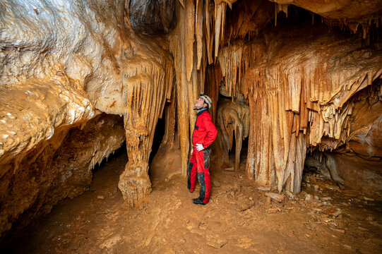 Adventurous girl is exploring the inside of a natural cave in Skaha Bluffs Provincial Park, Penticton, British Columbia, Canada.