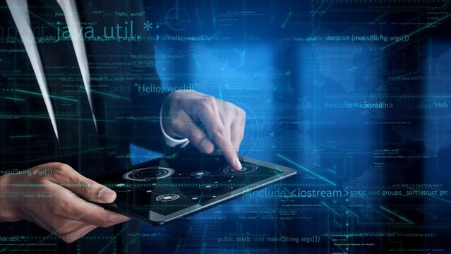 A focused business professional engages with a digital tablet, exploring advanced technology and data visualization through a futuristic interface rich with programming codes. Xenic
