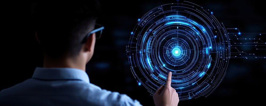 Man exploring digital space, interacting with a vibrant, floating blue square icon representing modern technology.