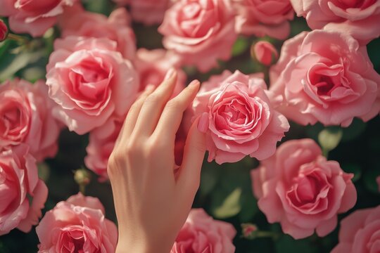 Close-up of woman's fingers exploring pink rose textures in romantic garden